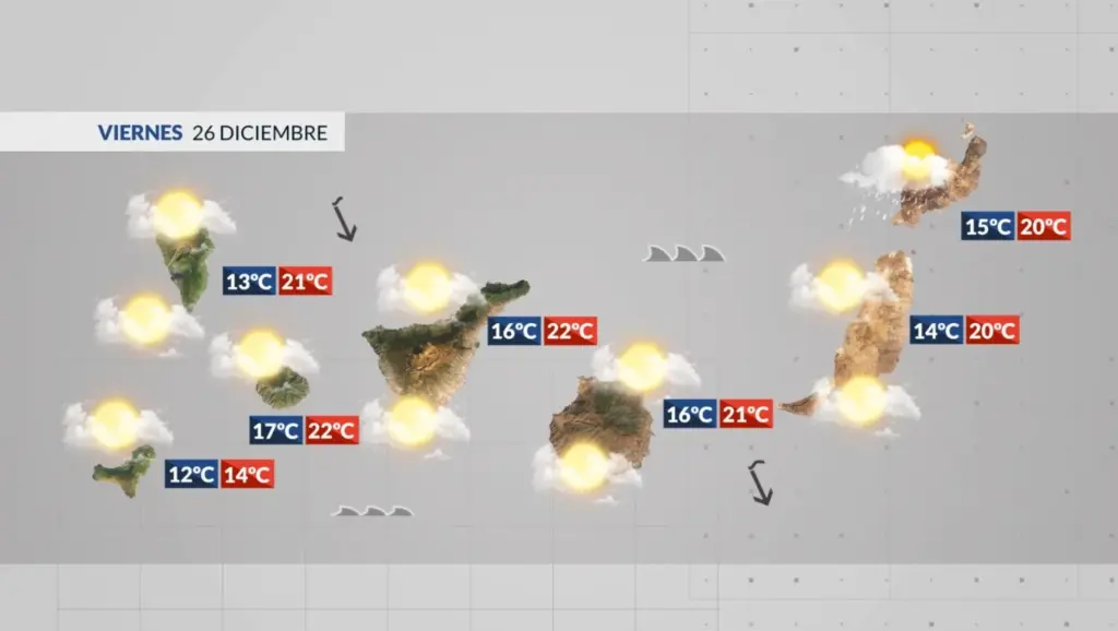 Previsión del tiempo en Canarias para este viernes 26 de diciembre. Este viernes tendremos una jornada marcada por el ambiente fresco con temperaturas que irán en ligero descenso y predominará los intervalos nubosos sobre todo en las vertientes N de las islas más montañosas y que ganará presencia en el S por la tarde.