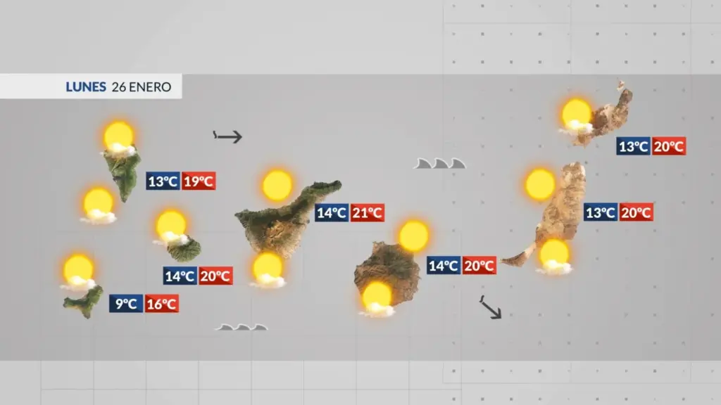 La semana comenzará sin grandes novedades meteorológicas. Este lunes predominarán los cielos poco nubosos o despejados, salvo algunos intervalos de nubes bajas matinales en zonas costeras y de evolución en vertientes Este-Sureste por la tarde. Las temperaturas apenas cambiarán, hará frío en horas nocturnas y al amanecer, máximas suaves entre 18 – 22ºC en zonas costeras.