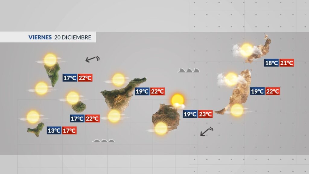 El Hierro: Este viernes será un día marcado por las nubes altas sin descartar a primera y última hora nubes bajas en las medianías. Temperaturas más frescas entre los 13 y los 17 grados.