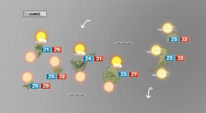 Habrán algunas nubes durante la madrugada y últimas horas por el norte. Calima en cumbres y medianías. Temperaturas máximas en ligero descenso. Viento flojo a moderado de componente norte, con algunos intervalos de mayor intensidad en las vertientes este y oeste