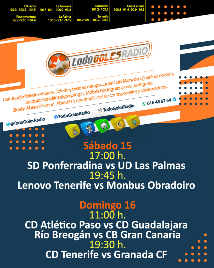 La onda deportiva se escucha en Canarias Radio. Miles de aficionados que acuden ilusionados a animar a su equipo en busca de la victoria encuentran, además, en Todo Goles Radio un minucioso seguimiento de los partidos con la narración de Juan Luis Monzón y Joaquín González.
