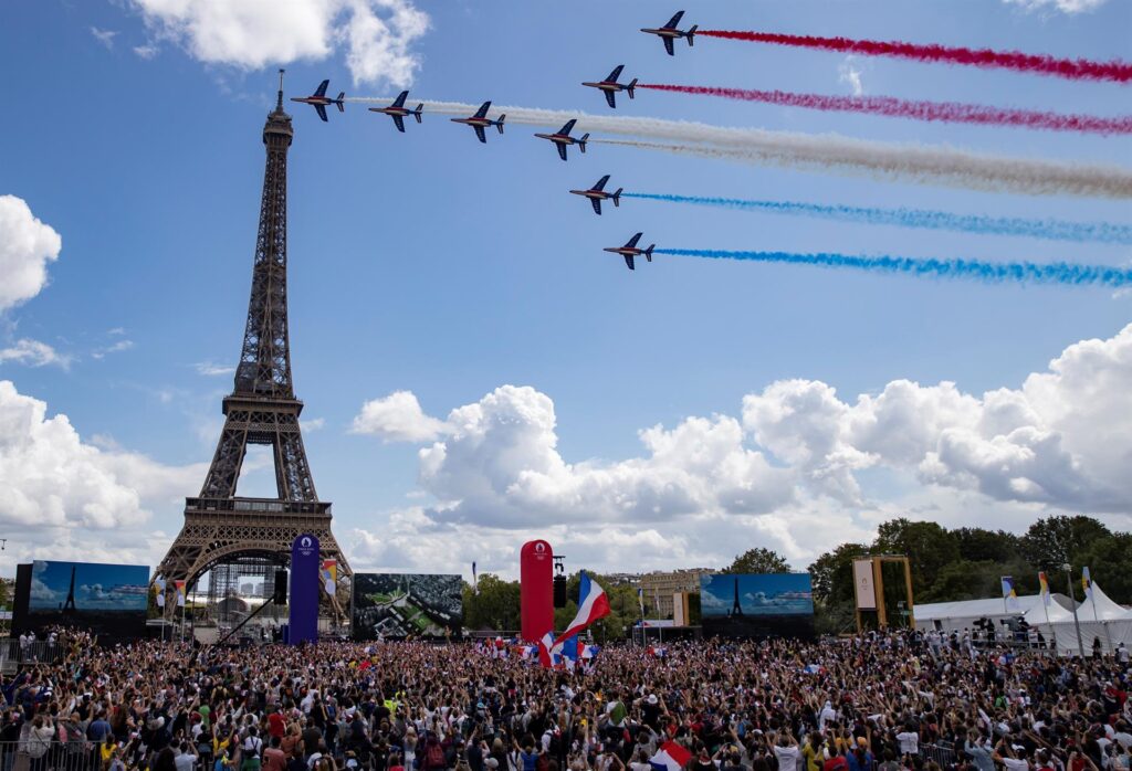 Tokio conectó después en directo con París, donde las cámaras ubicadas frente a la Torre Eiffel mostraron a una multitud celebrando la cuenta atrás para los próximos Juegos Olímpicos. Mientras la unidad de vuelo acrobático del ejército francés, la Patrouille de France, dibujó la bandera nacional en el cielo.