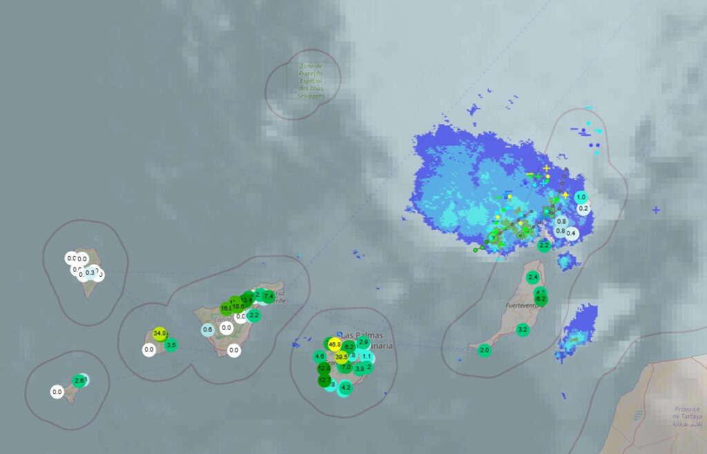La estación de la Agencia Estatal de Meteorología, AEMET, ubicada en La Suerte Alta, en Agaete, ha registrado 46,8 litros por metro cuadrado hasta las 17 horas. Otros registros, en Tejeda, han contabilizado 38,5 litros por metro cuadrado.