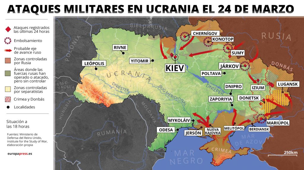 Un alto funcionario del Ministerio de Defensa ha detallado en rueda de prensa que las fuerzas rusas no han hecho «ningún avance significativo» hacia la ciudad de Kiev en el norte y en el noroeste. «Seguimos viéndolos mover las fuerzas de retaguardia hacia adelante, pero no hay un progreso tangible desde ayer. Las fuerzas rusas al este de Kiev están a unos 30 kilómetros de distancia», ha dicho.