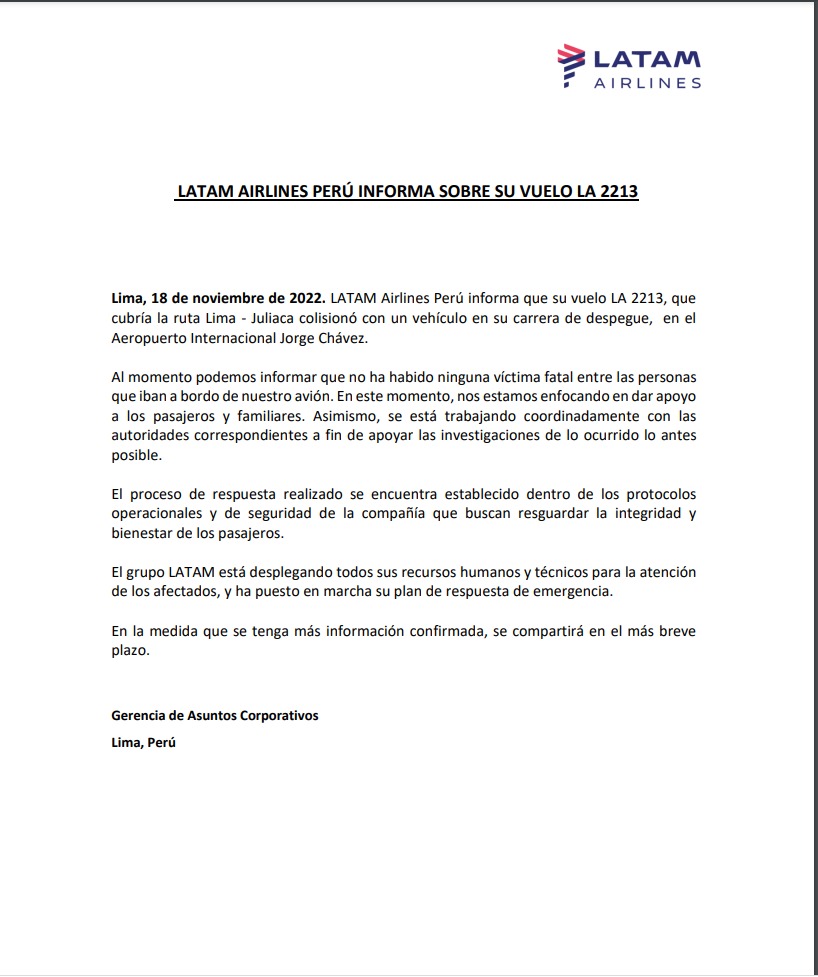 La empresa operadora del aeropuerto Jorge Chávez, Lima Airport Partners, ha lamentado lo ocurrido. El avión cubría la ruta entre Lima y la ciudad de Juliaca, a unos 840 kilómetros de la capital y ubicada en el sureste de Perú.
