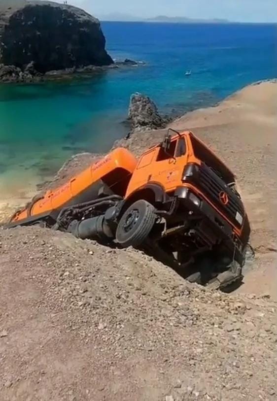 Durante la jornada de este jueves se produjo el vuelco de un camión cuba en Papagayo, en la isla de Lanzarote. El vehículo se quedó totalmente suspendido en el risco.