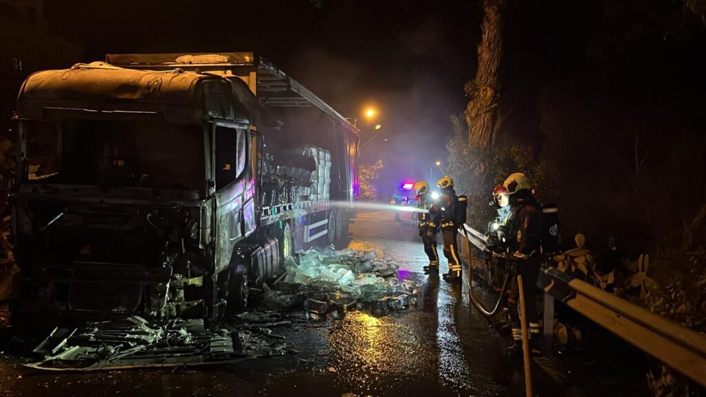 Los Bomberos del parque de Arucas acudieron al aviso del incendio en un camión en un lado de la carretera de GC 300. Los conductores se vieron sorprendidos ante la dimensión que alcanzaron las llamas.