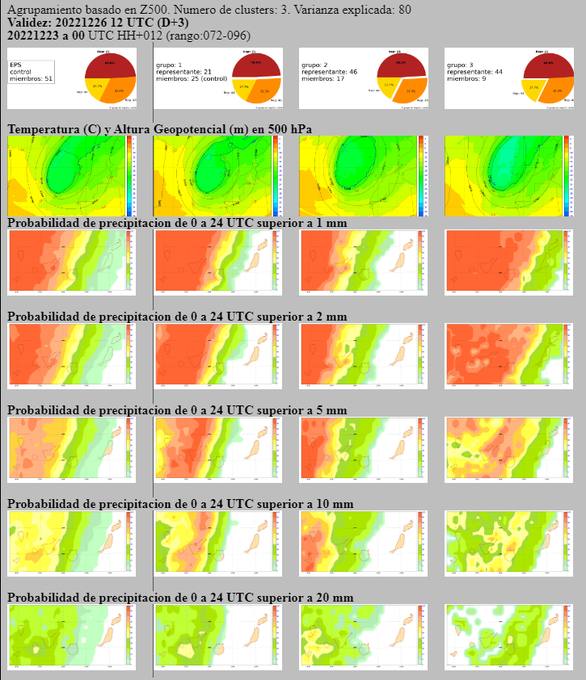 A pesar de la inherente incertidumbre de la situación, el aumento de la inestabilidad producirá precipitaciones en las islas de mayor relieve que pueden ser persistentes y acompañadas de tormentas. Una situación que se puede ver en la siguiente imagen en la que se muestra el número de grupos posibles.