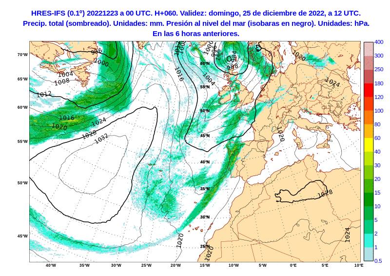 El domingo 25 un frente avanzará de oeste a este. Dejará precipitaciones que podrían ser localmente fuertes. A continuación se muestra la salida de precipitación del modelo IFS-HRES y la información de los avisos emitidos para ese día.
