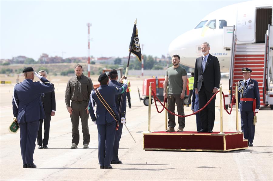 El presidente de Ucrania, Volodímir Zelenski, agradeció este lunes el “honor especial para Ucrania y para los ucranianos” que supone haber sido recibido personalmente en el aeropuerto a su llegada a España por el rey Felipe VI